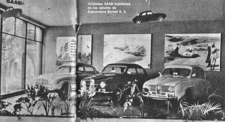 På väggen bakom 96:orna ser man planscherna för Saab i tävlingssammanhang och jaktplanet J35 Draken - två viktiga saker Saab gärna profilerade i sin marknadsföring. Men hur kommer det sig att dessa bilar hamnade i Uruguay?