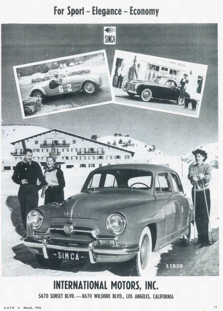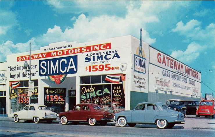 Vi är hos Gateway motors i Jacksonville nånstans mitten av femtiotalet. Europabilar var inte så ovanligt eller okänt som man i efterhand kan tyckas tro i USA. Simca hade börjat säljas redan 1952 och stannade kvar på USA-marknaden fram till 1972.