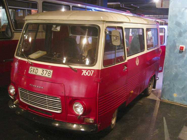 Ett av fordonen på Spårvägsmuseet är den här Peugeot J7, 1974 som använts som färdtjänstbuss av SL.