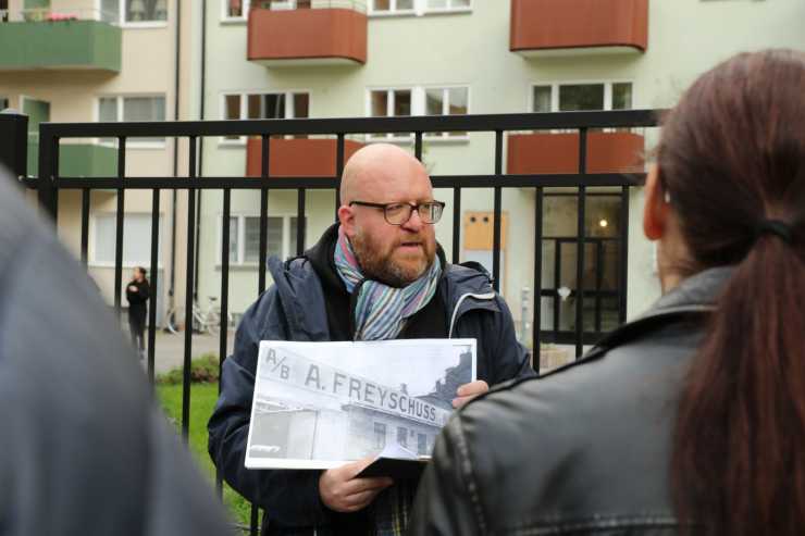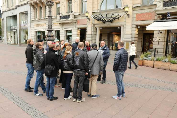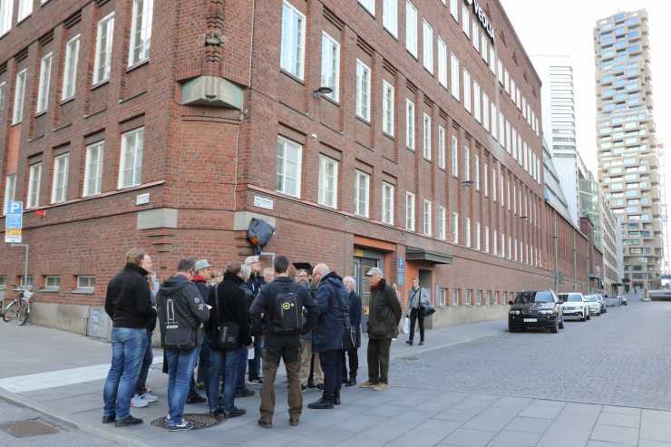 Klassikers Fredrik Nyblad guidade till platserna som var avgörande för att Volvo kunde grundas. Här är gruppen framför Sveavägen 126 där karosseribyggaren AB Adolf Freyschuss fanns.