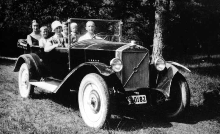 Gustaf Larson med familj fotograferad sommaren 1926 i en av de tio prototyper som byggdes i Stockholm.