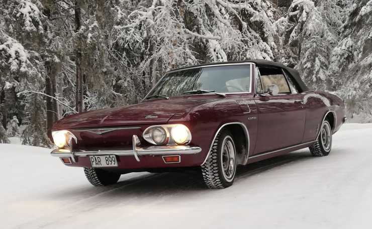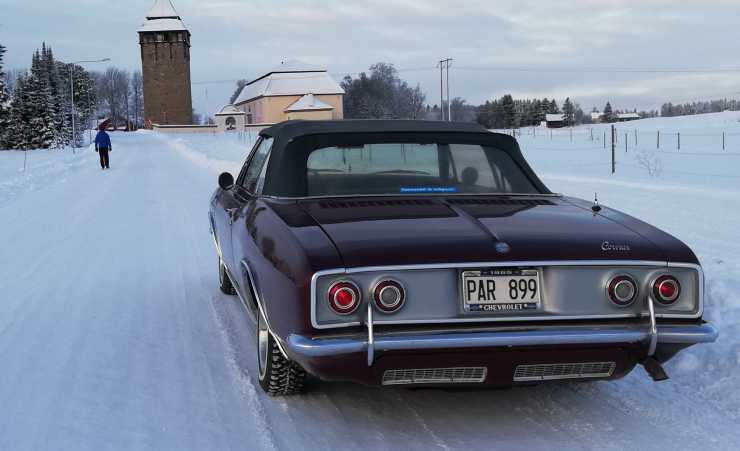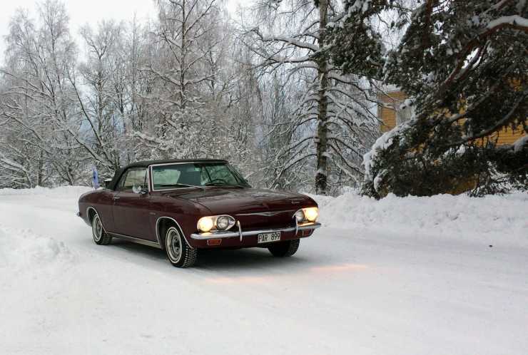 Arne Nilsson i Brunflo kör sin Chevrolet Corvair Corsa även på vintern. Att den har svansmotor och turbo är inget som stoppar honom.