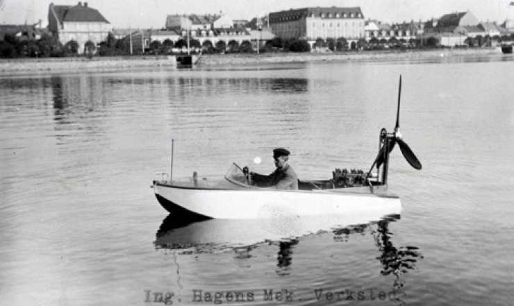 Sverre byggde andra morsomheter med, som denna propellerdrivna båt, med fyrcylindrig Chevroletmotor. En elbåt gjordes också.