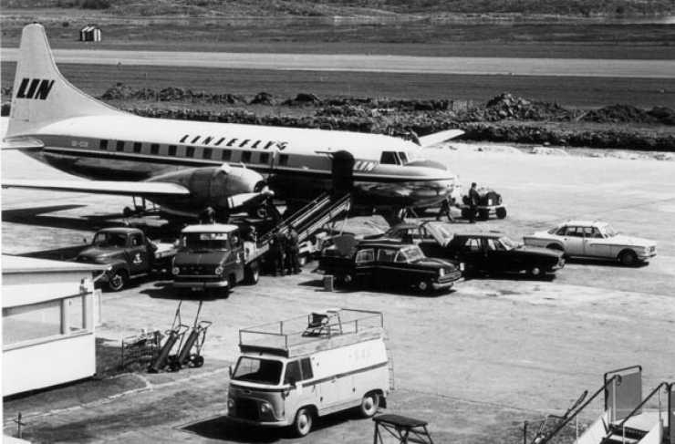 Linjeflygs Convair CV-340 lastas av med dagens skörd av kvällstidningar på Torslanda i Göteborg 1964. Två lastbilar, den ena en Opel Blitz, väntar tålmodigt tillsammans med ett par personbilar.