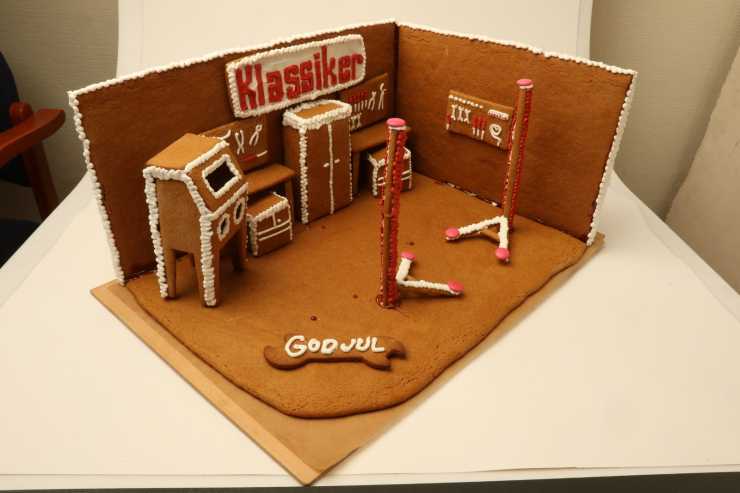 ”Idén att göra Klassikerverkstaden som pepparkakshus kom förra julen då jag gjorde Jävre Turiststation. Först tog jag bilder för att dokumentera hur verkstaden såg ut med verktygstavlor och blästerskåp. Alla pepparkakshusproffs tipsar om att man ska göra en modell i papper först, så då gjorde jag det. Jag började med golvet och väggarna och sedan möblerades de med verktyg, precis som bygget av den riktiga verkstaden gick till. Det är egentligen en väldigt god pepparkaksdeg men väggarna är gräddade så länge att de kanske inte är den smakligaste delen.