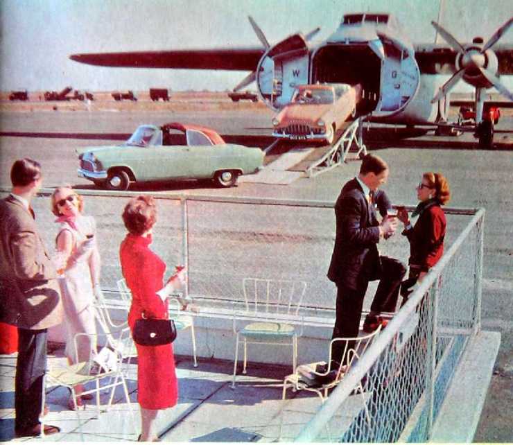 Under femtiotalet blossade charttrafiken upp, utlandsresor var inte längre förbehållet affärsmän och välbärgade. Och det var givet att man skulle ta med sig sin bil på semestern också. Här står glada resenärer med antagligen allt annat än alkoholfria drinkar på viewpoint och ser på när dessa två rätt ovanliga vagnar rullas ur en Bristol Freighter. Det rör sig om Ford Consul respektive Ford Zephyr i öppet utförande vilket var ovanliga modeller. Bilden är från 1957.