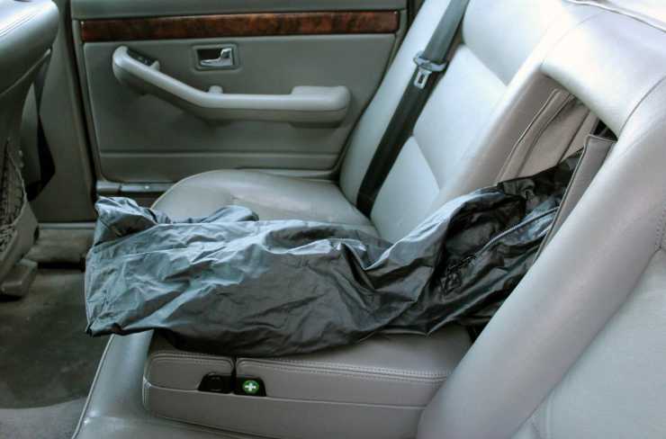 Skidbagen, som sitter i genoimlastningsluckan i baksätet. Mittkonsollen innehåller drickahållare, och första hjälpenpaket.