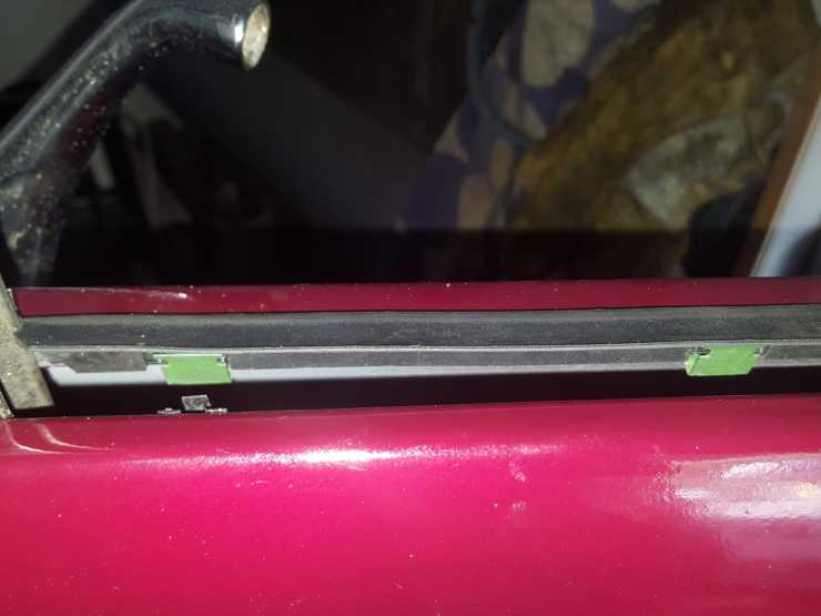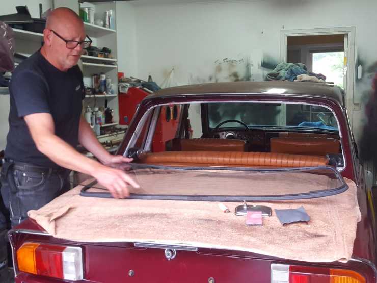 Dags att sätta i bakrutan igen, med ny tätlist - den gamla var så dåligt att rutan nästan gick att trycka in i kupén!