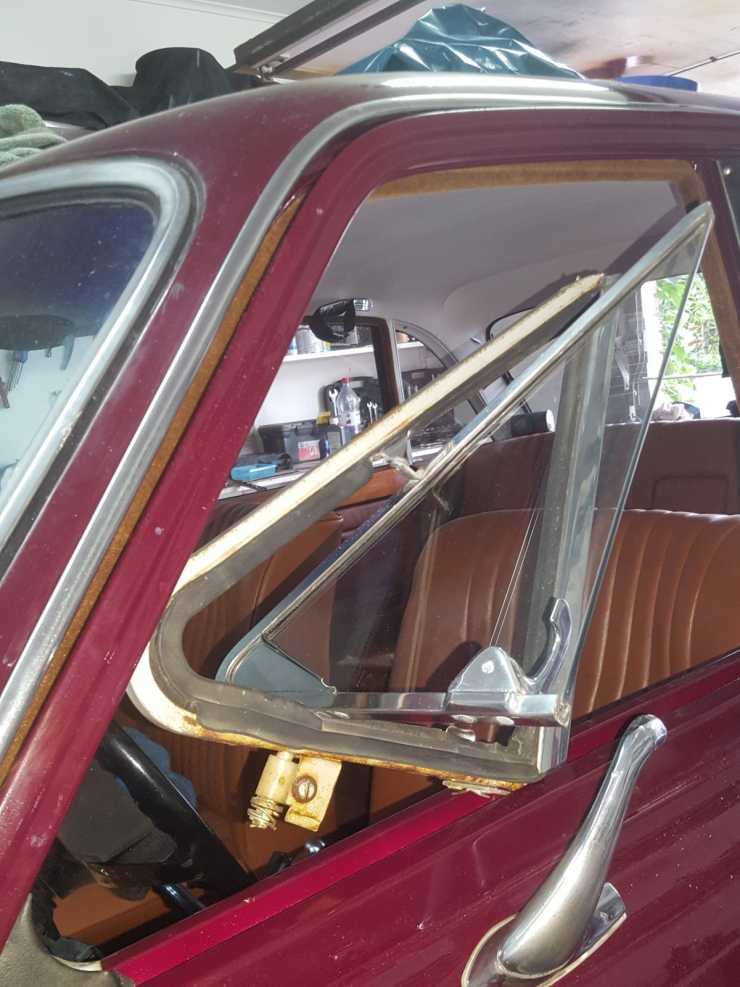 Återmontering av dörrar, det är ett pilligt jobb däri vilken ordning momenten skall göras inte alltid är i logisk följd på dom här bilarna. Ventilationsrutan är lite meckig. Då nedre fästet är för stort för att passa genom springan måste den fösrt vinklas kraftigt. Men även då är det oundvikligt man skadar lacken... Sen måste rutan öppnas helt för att gångjärnet skall gå (nästan) fritt också. Sen måste den stängas för att passformen skall bli rätt. Hela insatsten sitter med en skruv och två nitar...