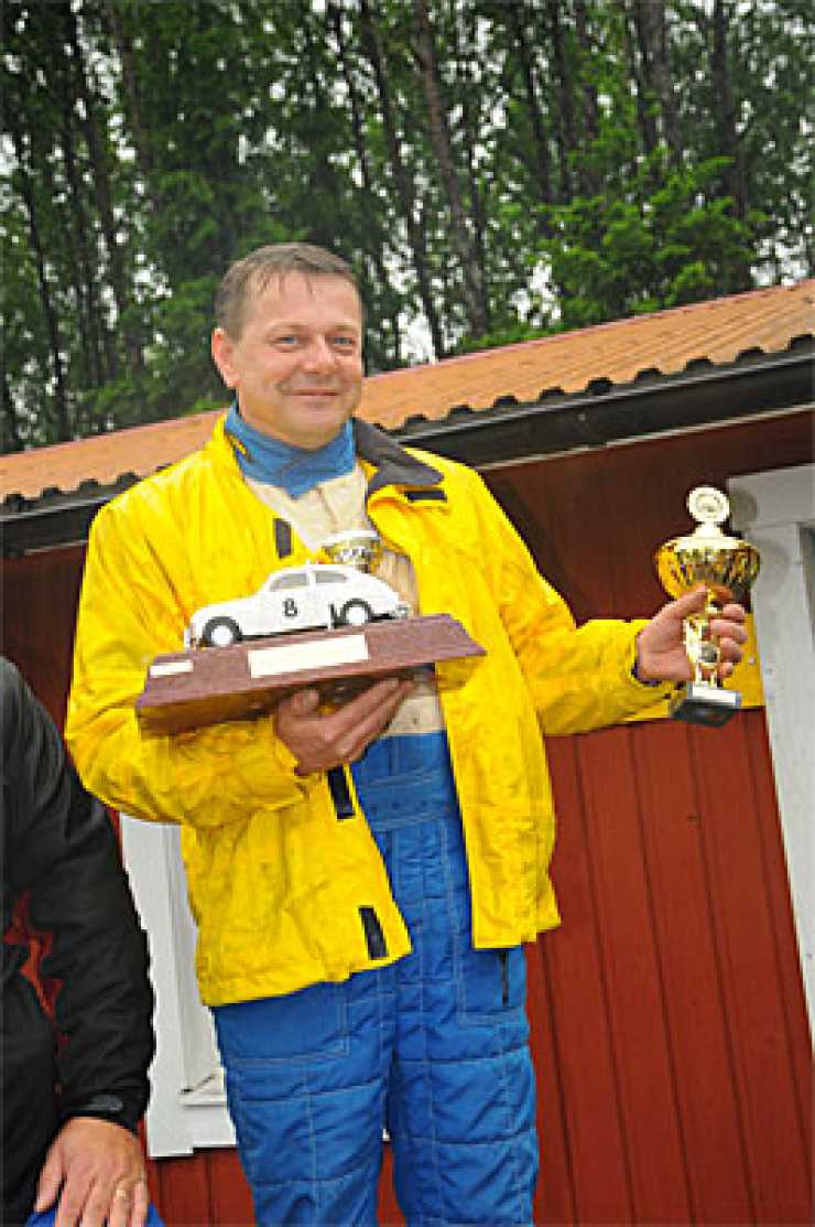 En glad Arne Bäckström tar emot pokal och Klassikers vandringspris efter segern i Klassikersprinten 2009. Den första med Audi Quattro i historiskt rally i Sverige.