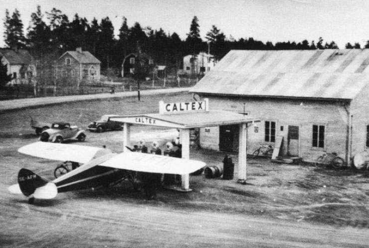 Den egendomliga bilden har sin förklaring i att i närheten låg ett flygstråk, och planen kunde i princip bara taxa över vägen för att tanka på Caltexmacken i Söderala, Myskje, i utkanten av Marmaskogen, Gävleborg.