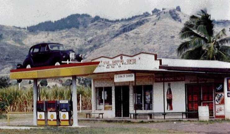 Det osäkert om det ens behövs en bensinstation till på samma ö, men den här gamla Shellmacken ligger i alla fall i Raviravi och taket pryds av en Austin A40 Devon.