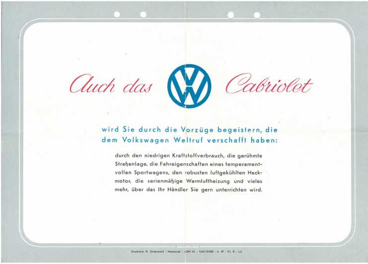 I en osorterad hög på ett marknadsbord hittade vi en tummad broschyr på VW Zweisitzer Cabriolet tryckt av Druckerei H. Osterwald i juni 1949.