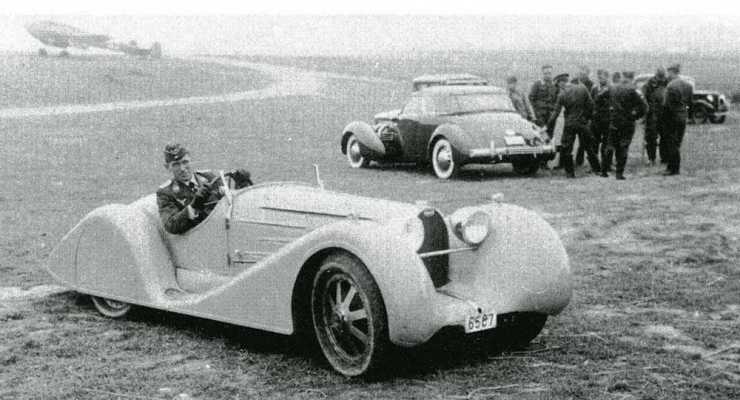 Det här fotot är högst troligt taget någonstans i norra Frankrike 1940, I bakgrunden står en kompressormatad Cord. Officeren har blivit "förlänad" Bugattin av Luftwaffe som belöning för sina insatser. Inte ovanligt att man delade ut stulet krigsbyte till förtjänstfulla officerare och det kan antas att Corden också rönt ett liknande öde.