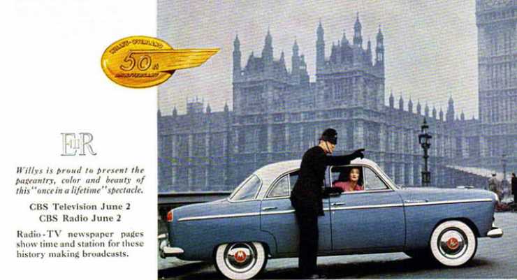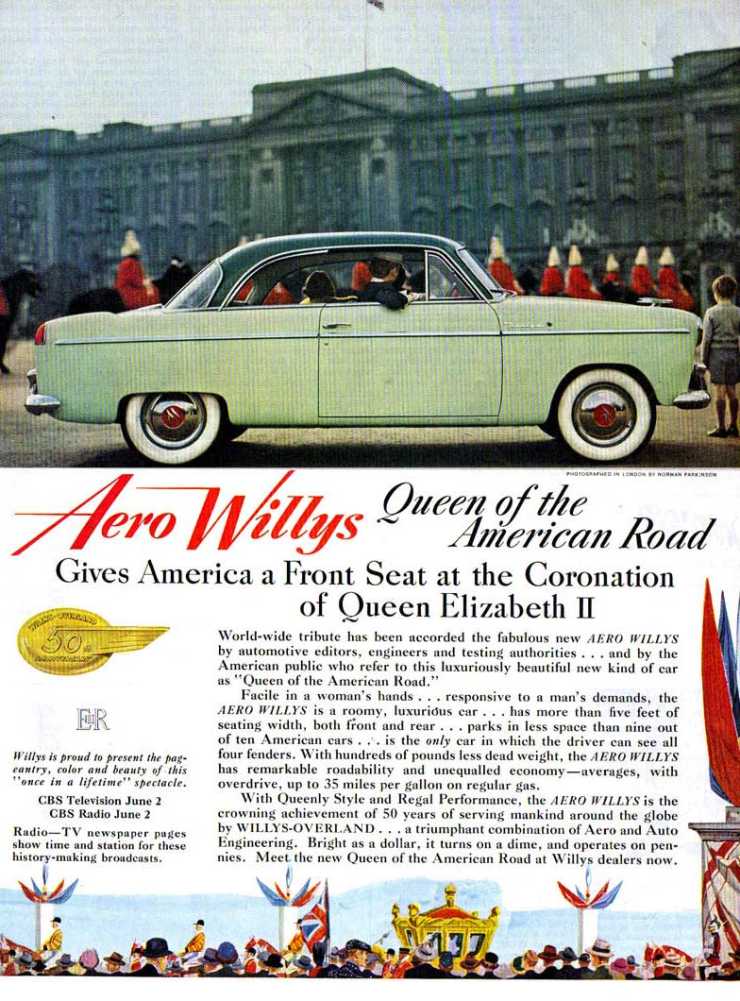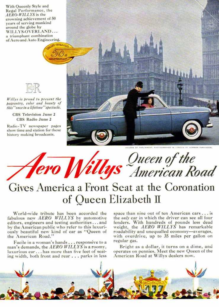Efter kriget byggde man vidare på Jeep-varianter som även blev en stor succé i det civila, först 1952 presenterades en vanlig bil från Willys igen. Året efter, 1953 var det dels Willys 50-årsjubileum, dels kröningen av drottning Elizabeth II av England. Willys tog fasta på båda i denna annonskampanj 1953.