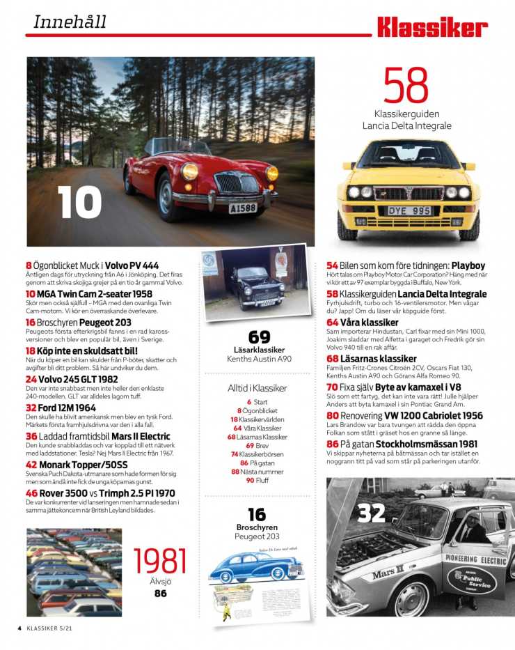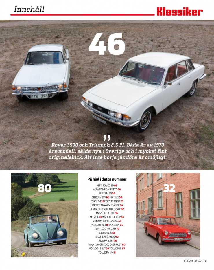 I nya Klassiker kör vi MGA Twin Cam, Volvo 245 GLT och det brittiska styvsyskonparet Rover 3500 och Triumph 2.5 PI. Vi berättar också den laddade historien om elbilen Mars II Electric och reder ut Lancia Delta HF Integrale i en mycket grundlig köpguide. På köpet får du dessutom Klassikers unika körjournal och ett dekalark med fantastiska klistermärken!