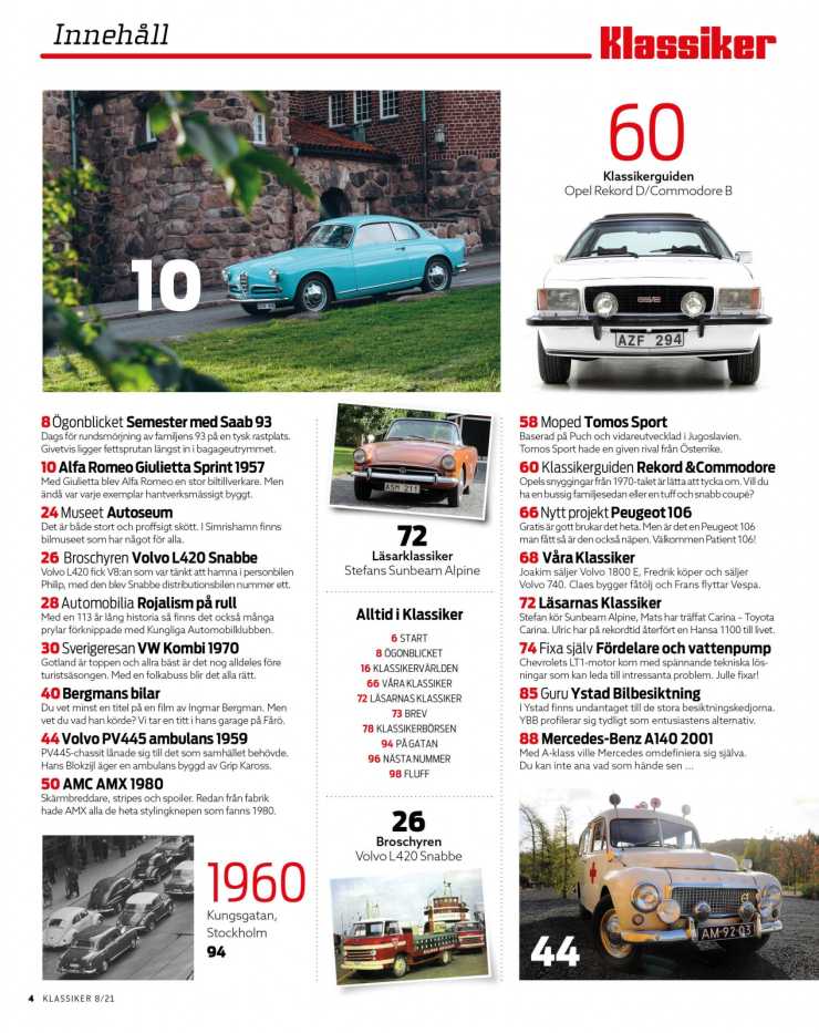 Magisk Volkswagenresa på Gotland och Fårö, en Mercedes A-klass som aldrig vält och en guide till Opel Rekord och Commodore som skapar svårt habegär. Dessutom en gratis Peugeot, Volvo 445 Ambulans, Kungliga Automobilklubben och en Chevrolet Corvette i Julles verkstad. Det är klart att du inte får missa senaste Klassiker!