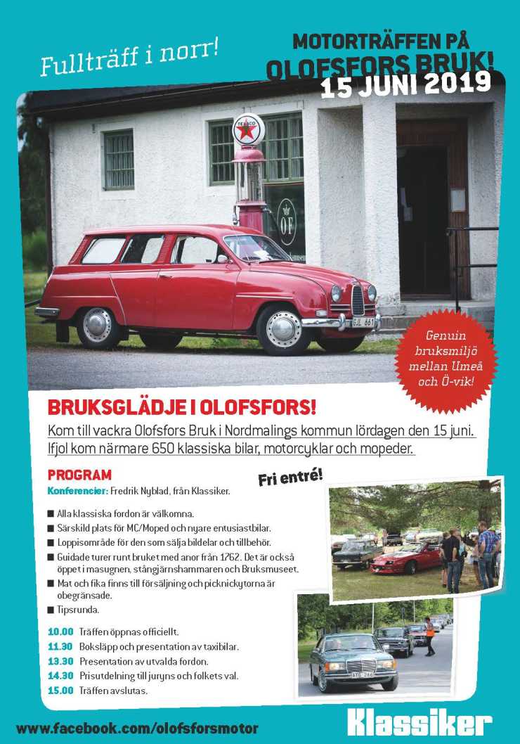 Motorträffen i Olofsfors hålls lördagen den 15 juni och pågår klockan 10-15. Förutom bilutställningen finns ett loppisområde. Man kan också gå sommarens kanske svåraste tipsrunda. Guidade turer hålls kring bruket med anor från 1762. Mat och dryck finns att köpa och picknickytorna är obegränsade. Olofsfors bruk ligger i Nordmalings kommun mellan Umeå och Örnsköldsvik. Det är fri entré.