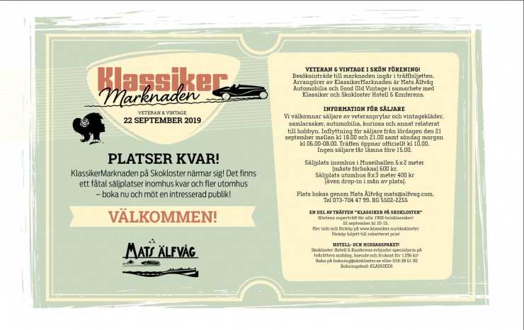 Arrangörer av KlassikerMarknaden är Mats Älfvåg Automobilia och Good Old Vintage i samarbete med Klassiker och Skokloster Hotell & Konferens.