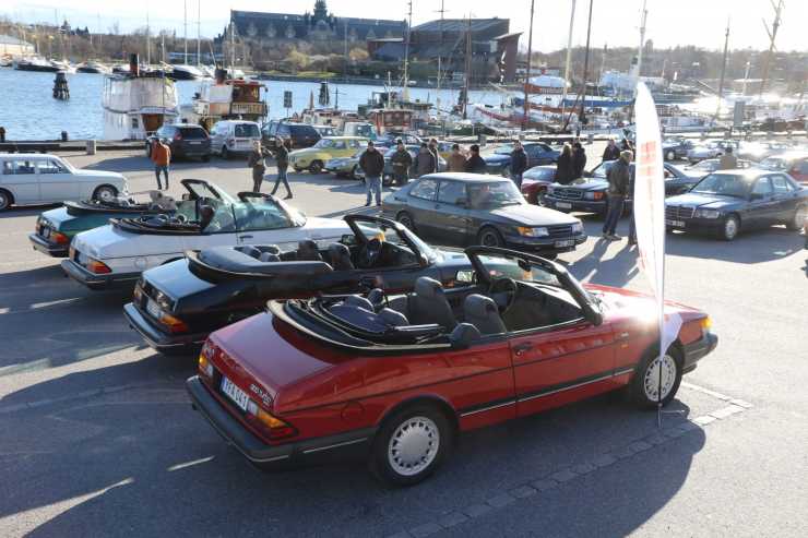 Färgpaletter över bilkulörer existerar för det mesta bara i bilbroschyrer. Men den som kom till årets första Frukostklubb fick sig se två färgpaletter från två olika svenska biltillverkare. Inte mindre än fem Volvo Amazon kom samtidigt till träffen och kunde då ställa upp sig bredvid varandra. Med lite arbete lyckades vi få till en motsvarande palett för Saab 900 Cabriolet med åtminstone fyra kulörer – inklusive Klassikers Talladegaröda bil.