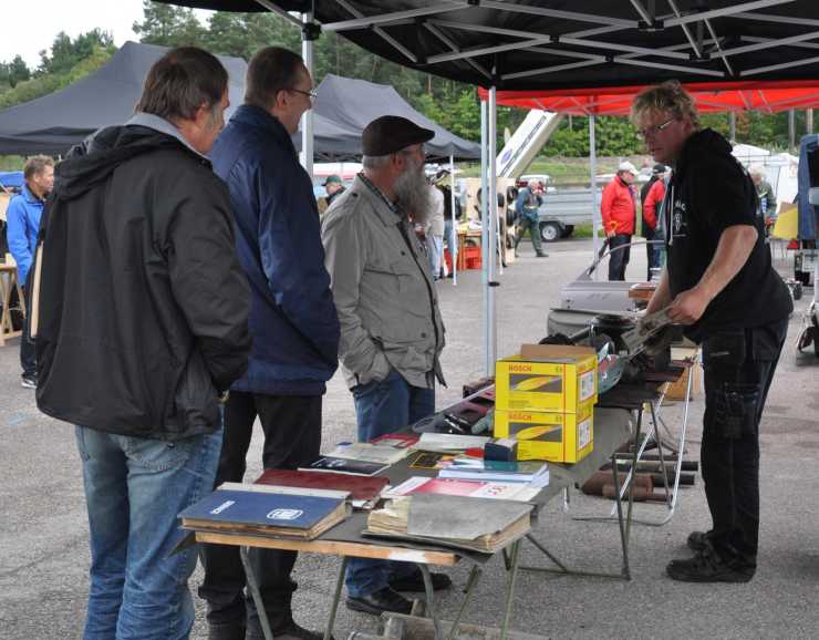 På söndagen är den stora marknadsdagen och då kommer alla som tycker om Saab och en del andra nyfikna. Det speciella med denna marknad är att det bara säljes sådant som är Saabrelaterat. Vi har också en finbilsparkering för alla som inte kommer med just Saabar.