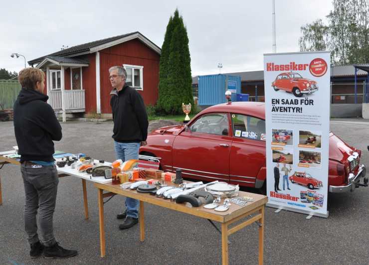 På lördagen regnade det en hel del, men vad gör väl det när man kan umgås med likasinnade. Dock var vi lite oroliga för att söndagens marknad skulle regna bort för enligt SMHI skulle det bli mycket regn även på söndagen. Vi hade dock världens tur för regnet lyste med sin frånvaro till lunchtid på söndagen. Trots det dåliga vädret fick vi 34 säljare och cirka 500 besökare. Det var något färre än tidigare år med vi kan vara mycket nöjda ändå och det verkade som de flesta hade en trevlig dag i Saabens tecken.