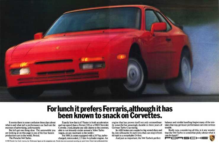 Att nämna konkurrenter vid namn är inget man gör i bilreklam idag. Men på 1980-talet gick det bra. Enligt den här tuffa tv-reklamen äter Porsche 944 Turbo både Ferrari och Corvette. Man glömde bara att nämna att den också konkurrerade med Porsche 911.